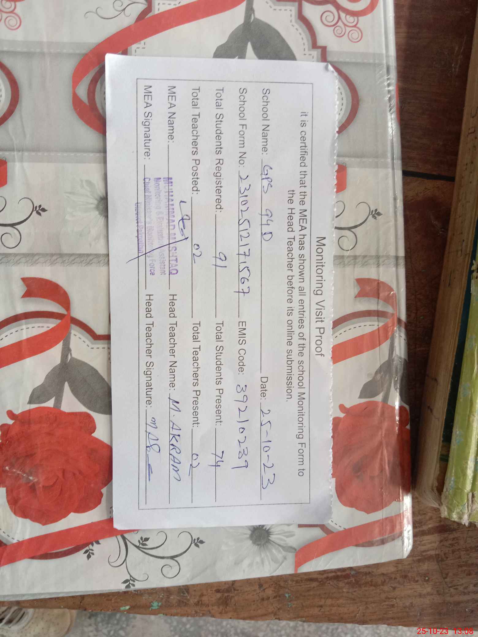 | Attendance Register | Head Teacher | MEA with School | Visit Proof |