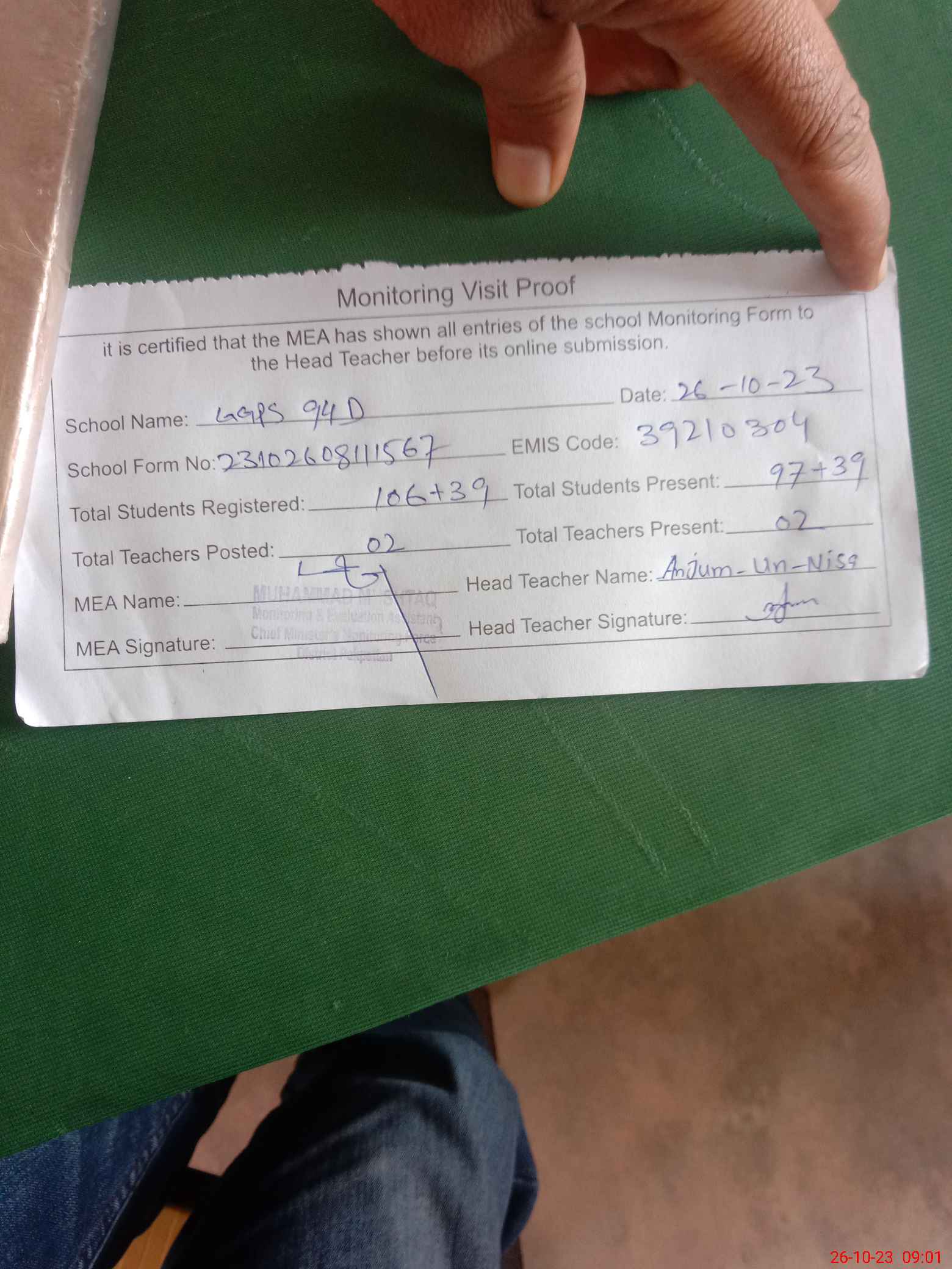 | EMIS Code: 39210304 | Name of School: GGPS 94 D | |||