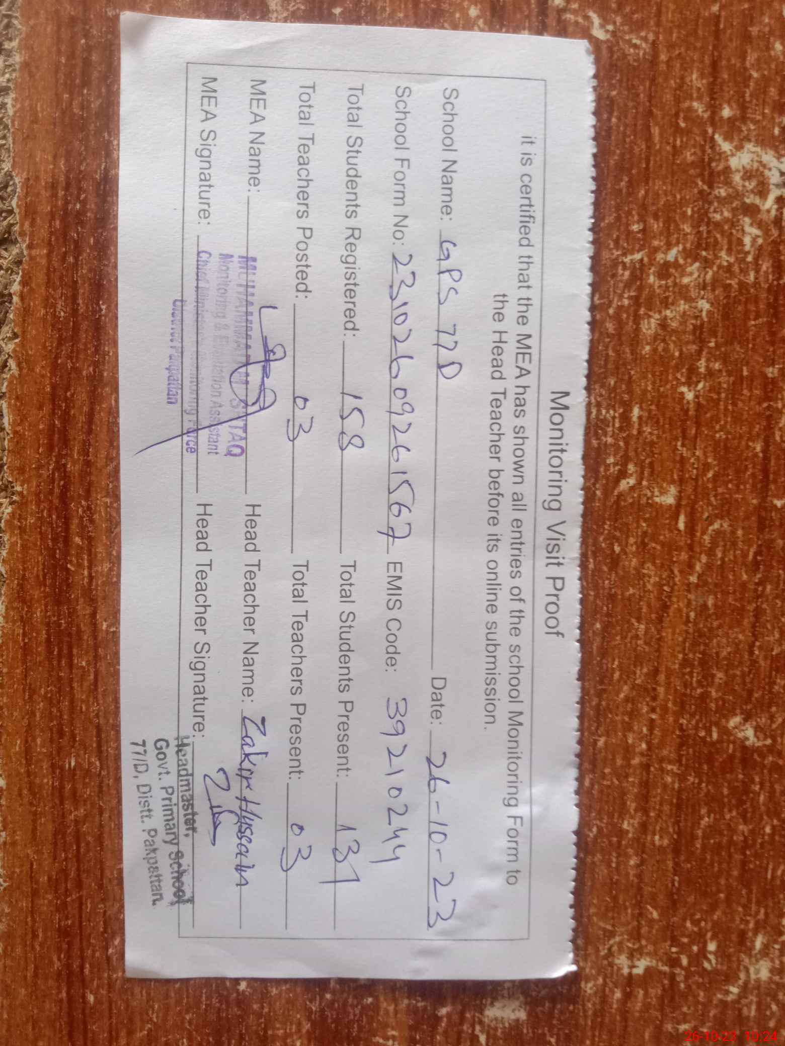 | Attendance Register | Head Teacher | MEA with School | Visit Proof |