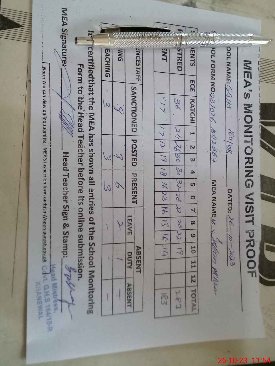 | Attendance Register | Head Teacher | MEA with School | Visit Proof |
