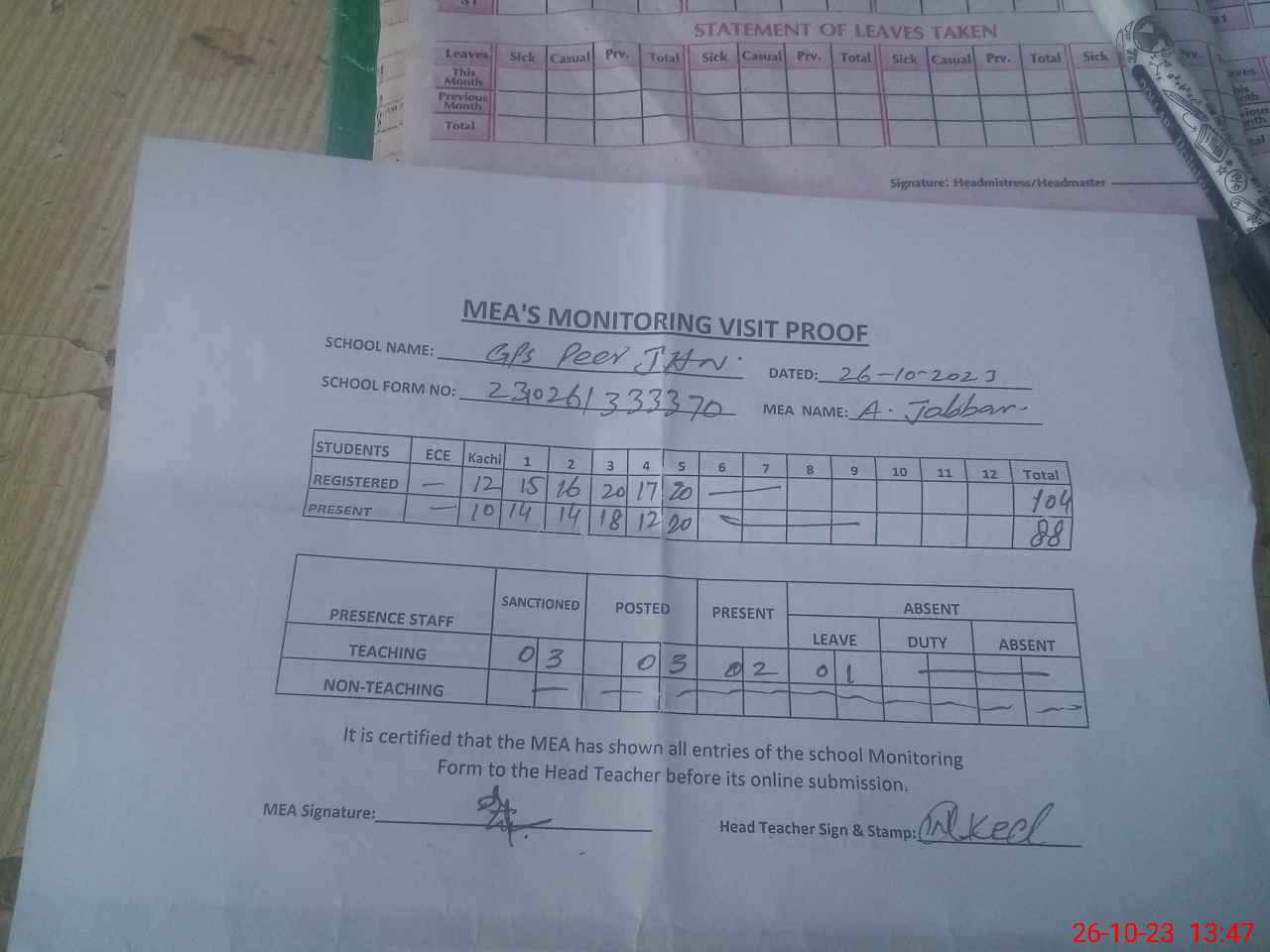 | Attendance Register | Head Teacher | MEA with School | Visit Proof |