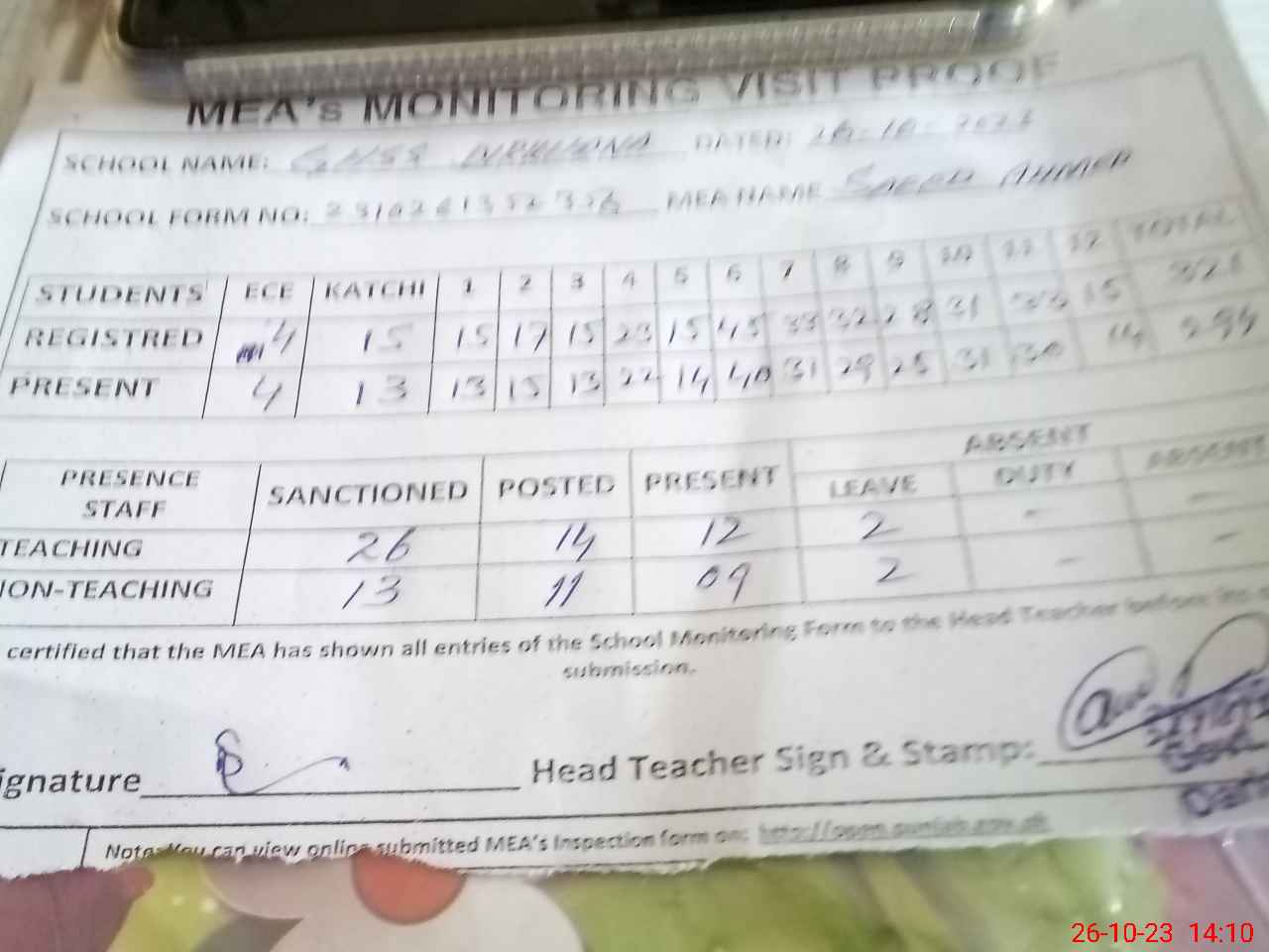 | Attendance Register | Head Teacher | MEA with School | Visit Proof |