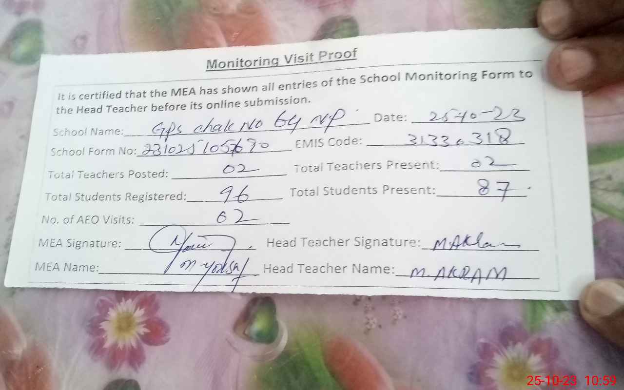 | EMIS Code: 31330318 | Name of School: GPS CHAK NO. 64/NP | |||