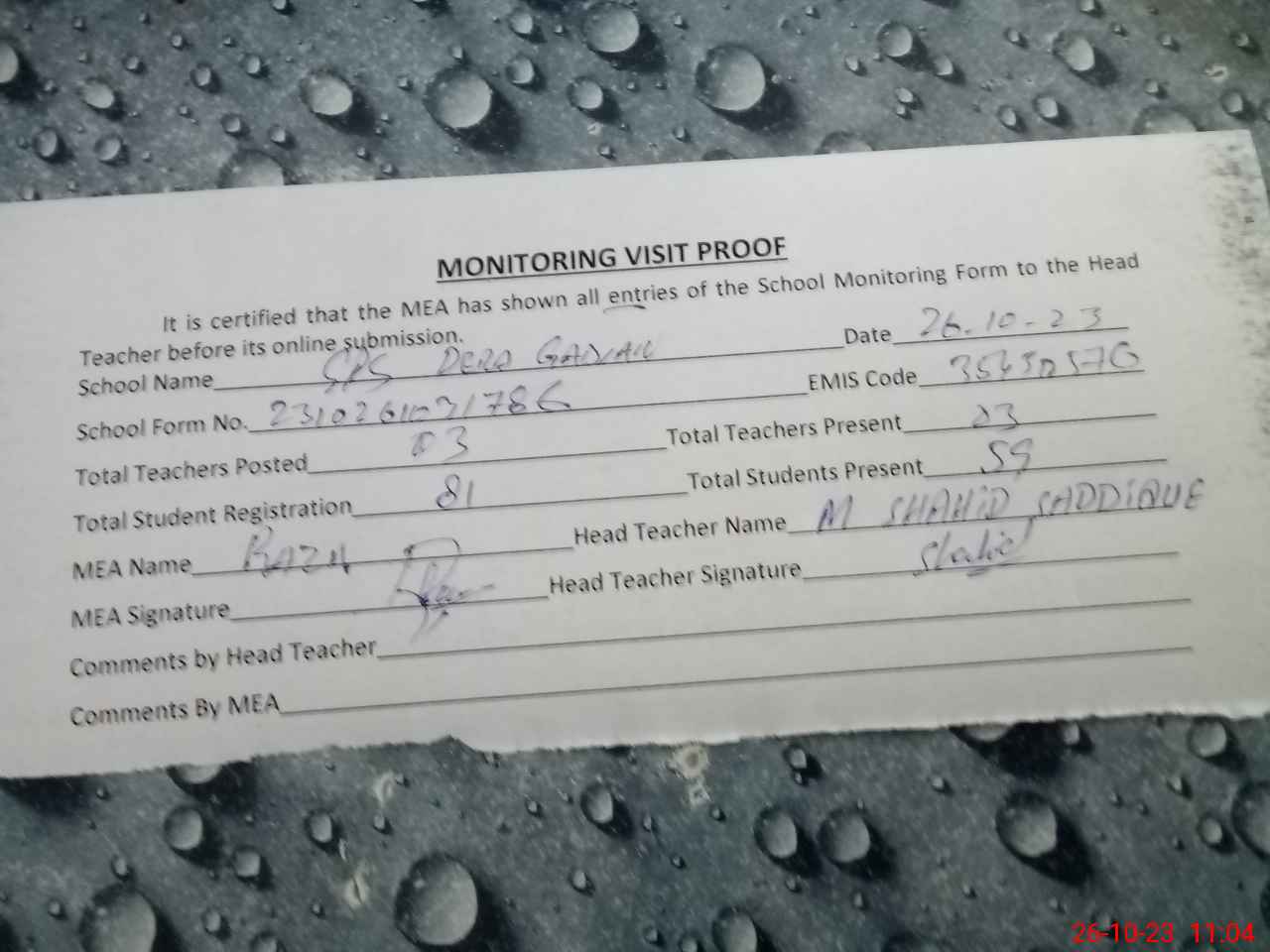 | Attendance Register | Head Teacher | MEA with School | Visit Proof |