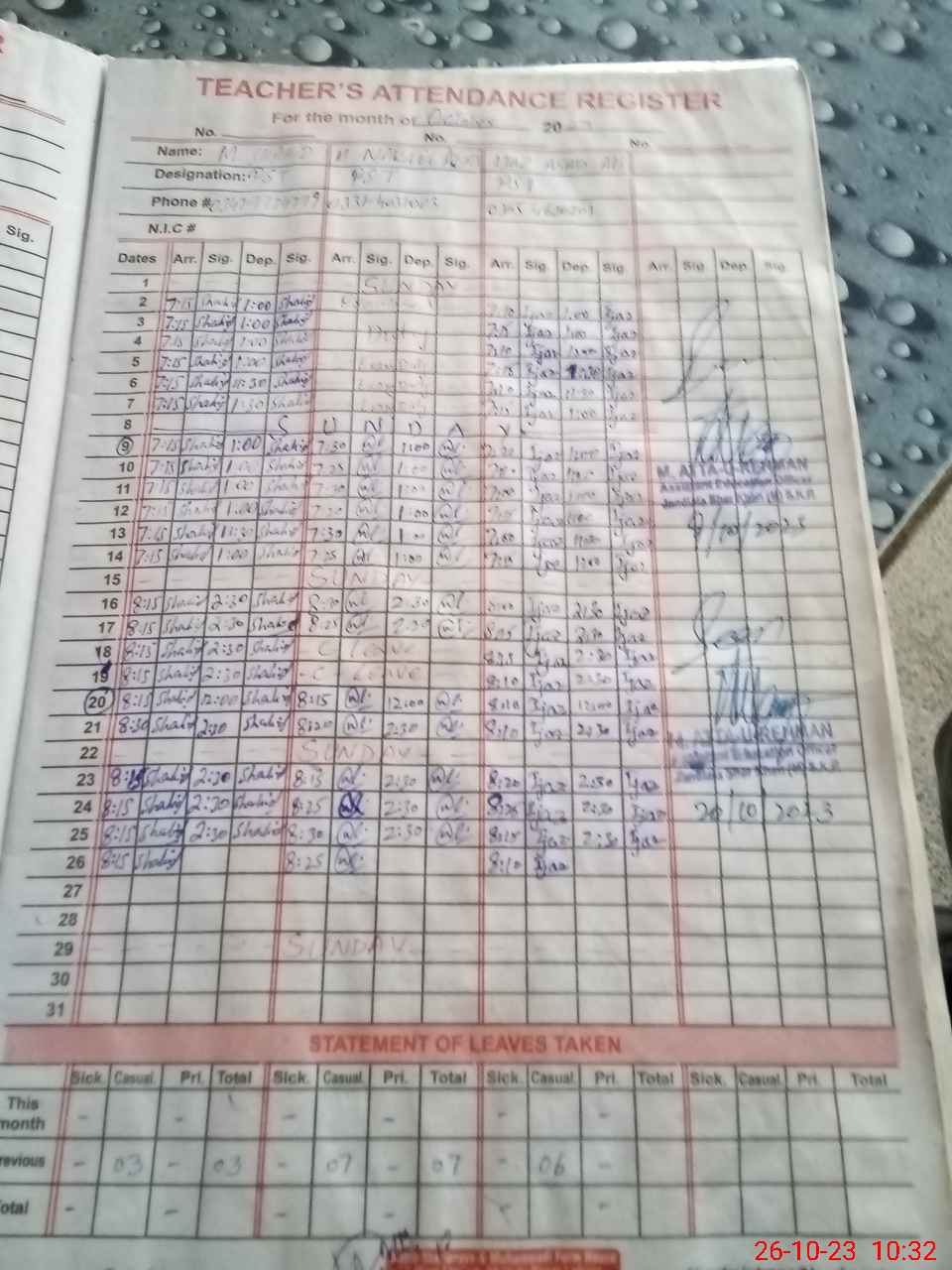 | CNIC | Full Name | Designation | R/C | Absence During Last Calender Month |