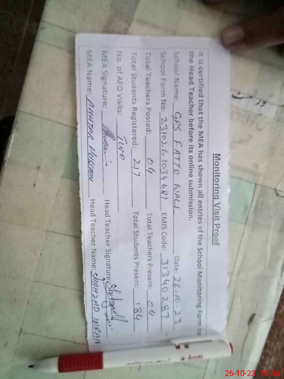 | Certified that this School was Inspected by the Undersigned MEA/DMO Today and the Information Stated Above is as Per Record. | |||||