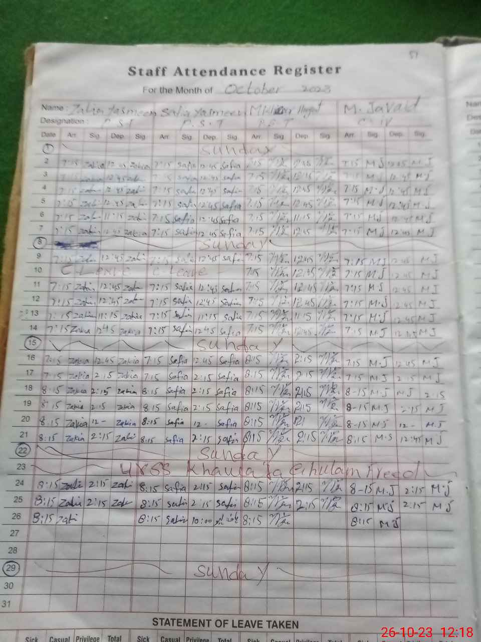 | 31**** | Sa**** Ya**** | 1 | 1 | 0 | 0 | 0 | 0 | 0 | 0 | 0 | 0 | 0 | Absent (Un-Authorized) |