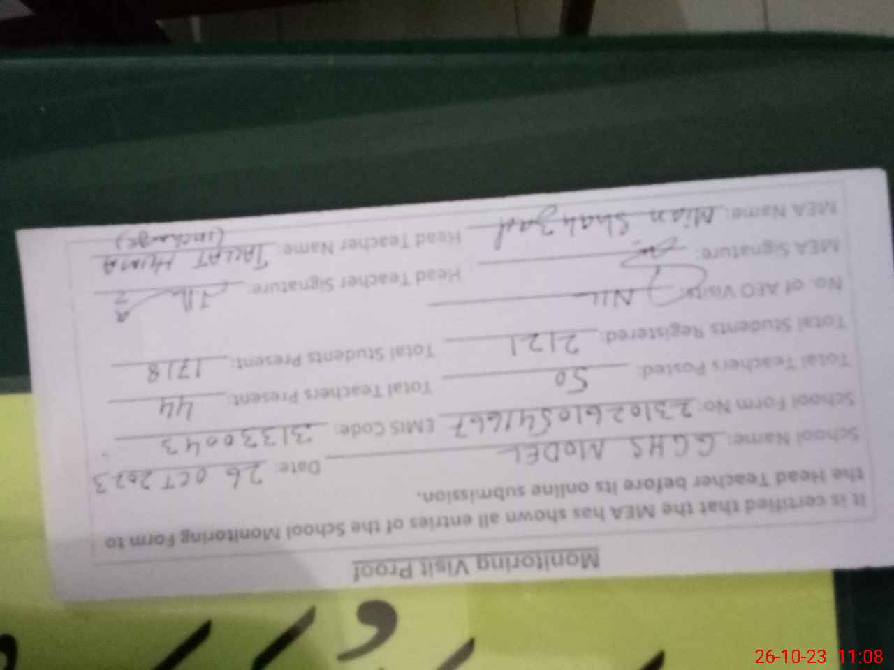 | Certified that this School was Inspected by the Undersigned MEA/DMO Today and the Information Stated Above is as Per Record. | |||||