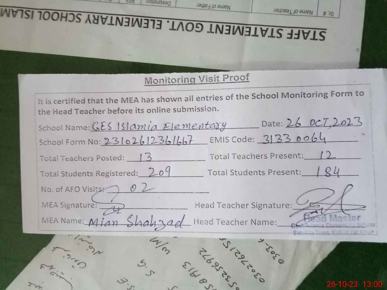 | Attendance Register | Head Teacher | MEA with School | Visit Proof |