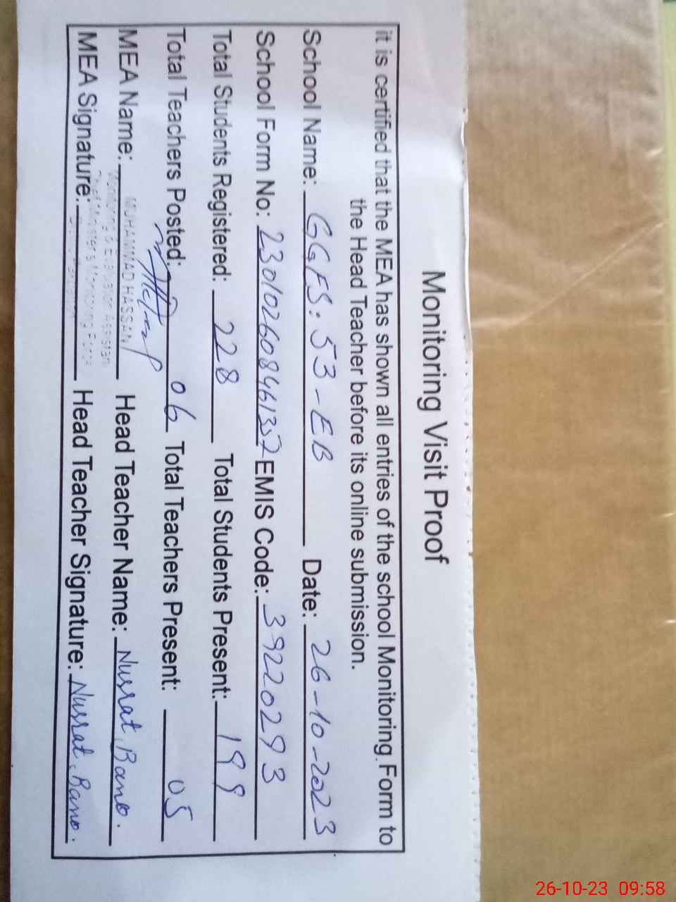 | Attendance Register | Head Teacher | MEA with School | Visit Proof |