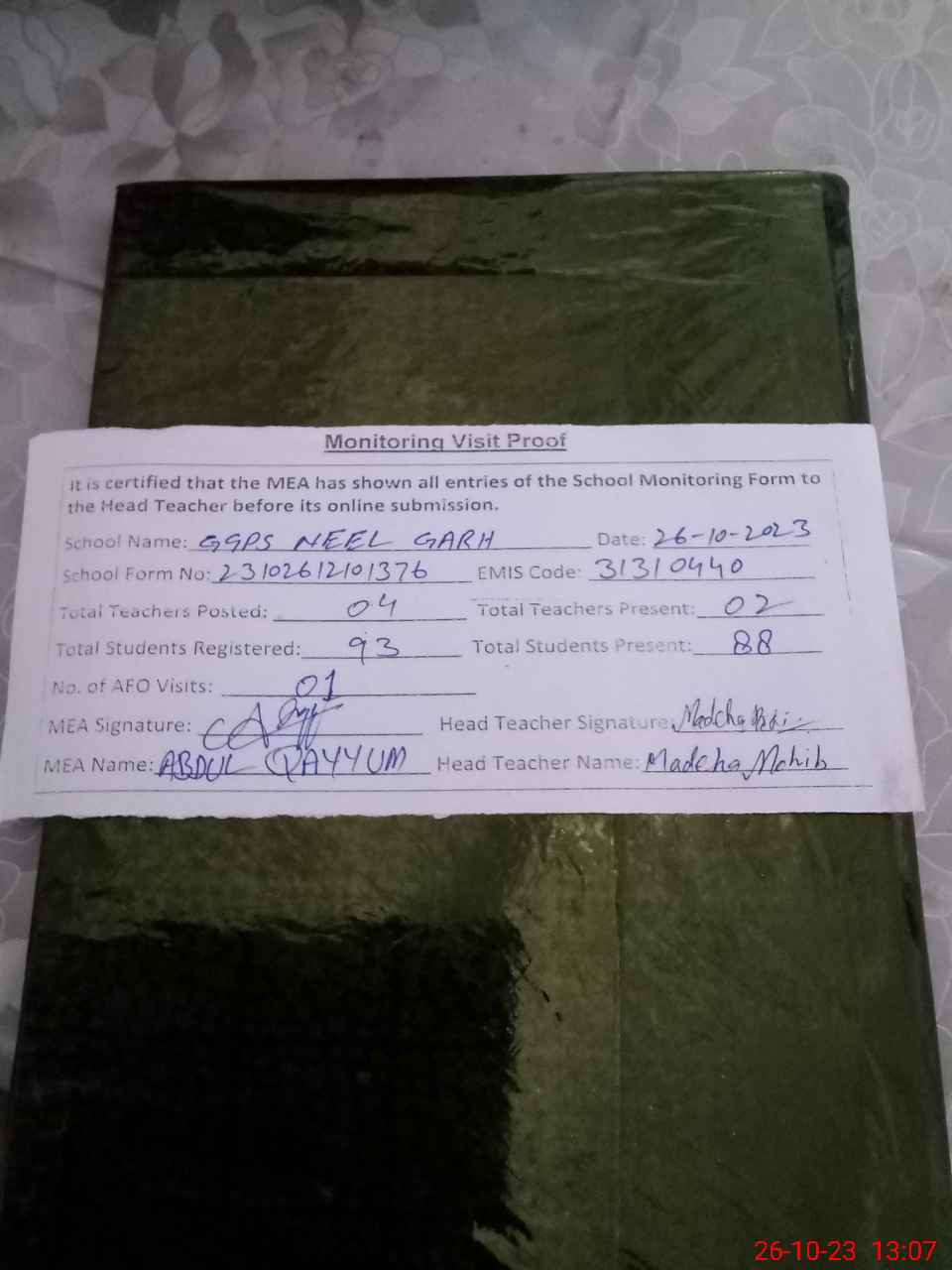| Attendance Register | Head Teacher | MEA with School | Visit Proof |