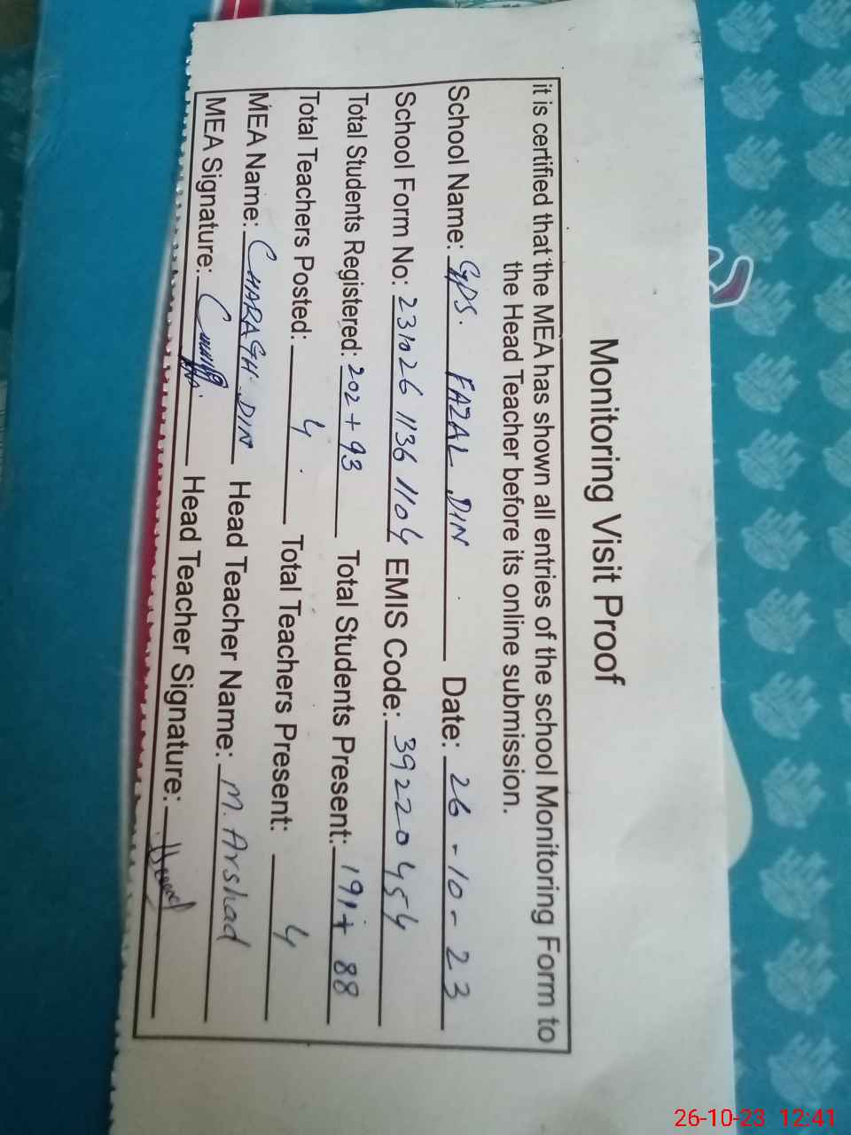 | EMIS Code: 39220454 | Name of School: GPS FAZAL DIN | |||
