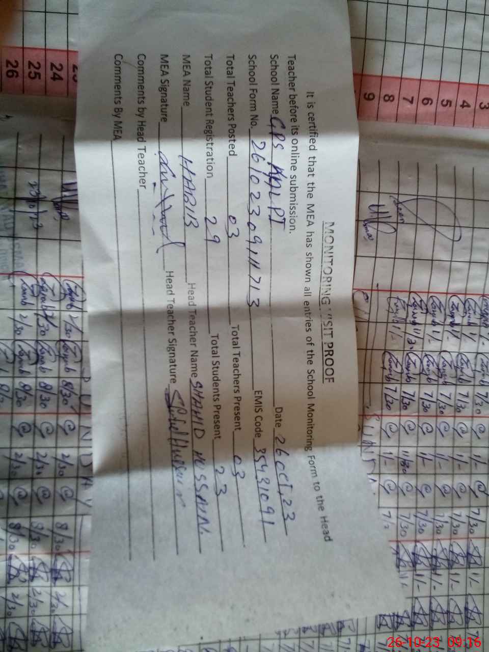 | Attendance Register | Head Teacher | MEA with School | Visit Proof |