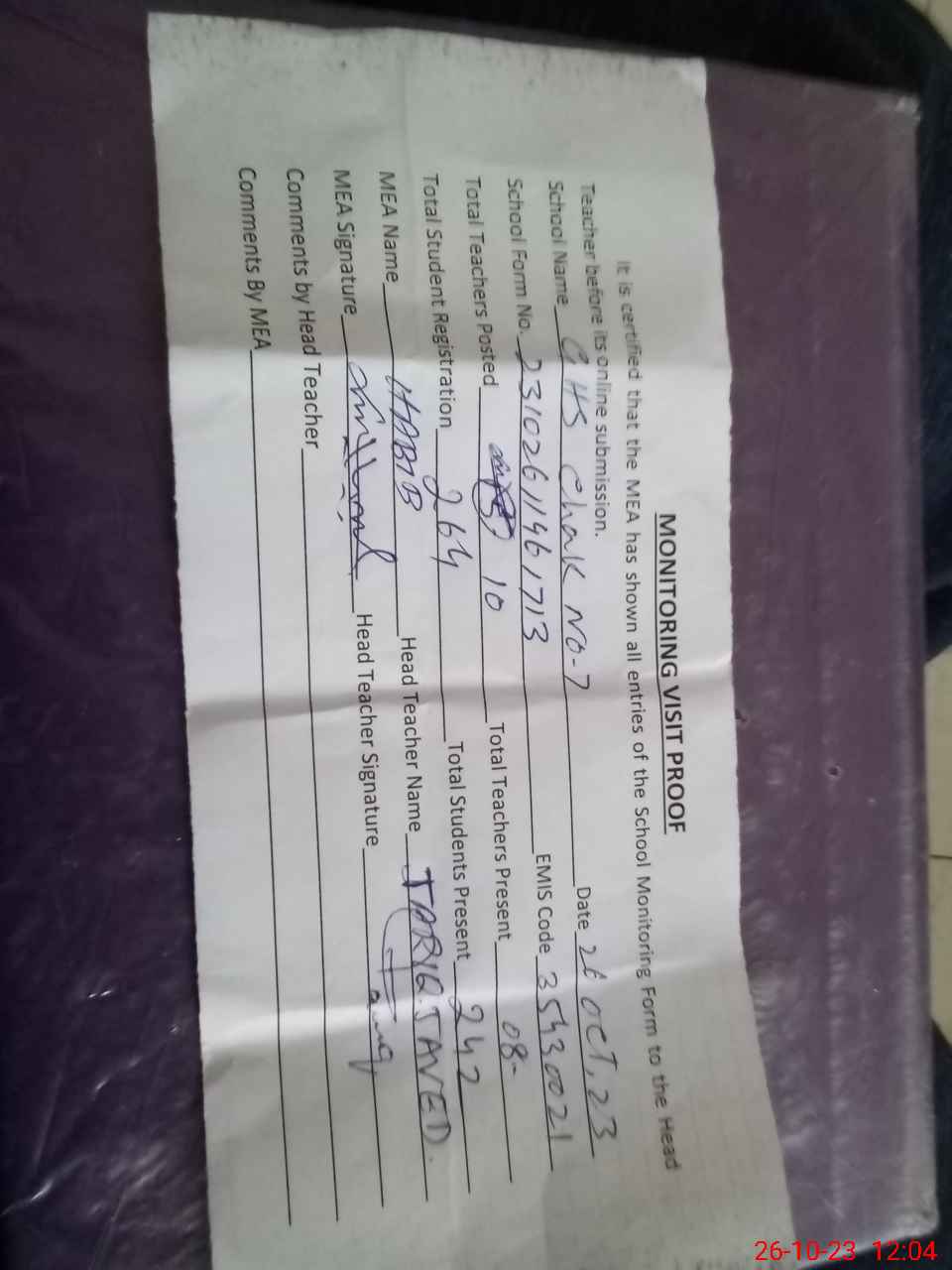| Attendance Register | Head Teacher | MEA with School | Visit Proof |