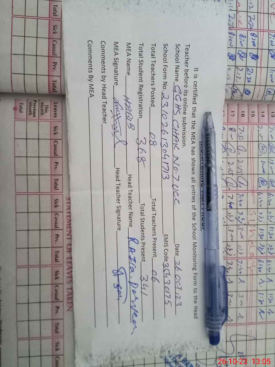 | Attendance Register | Head Teacher | MEA with School | Visit Proof |