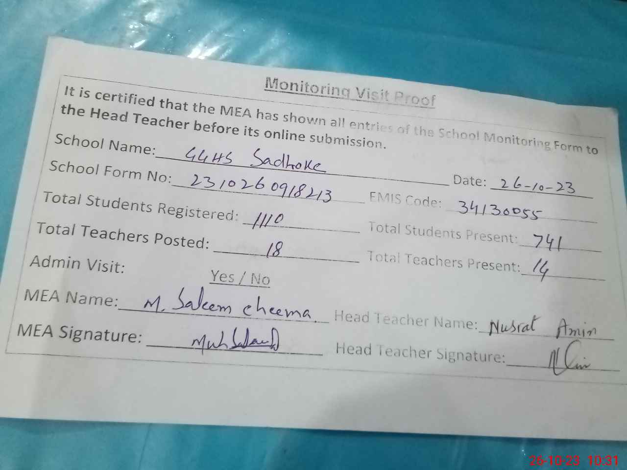 | Attendance Register | Head Teacher | MEA with School | Visit Proof |