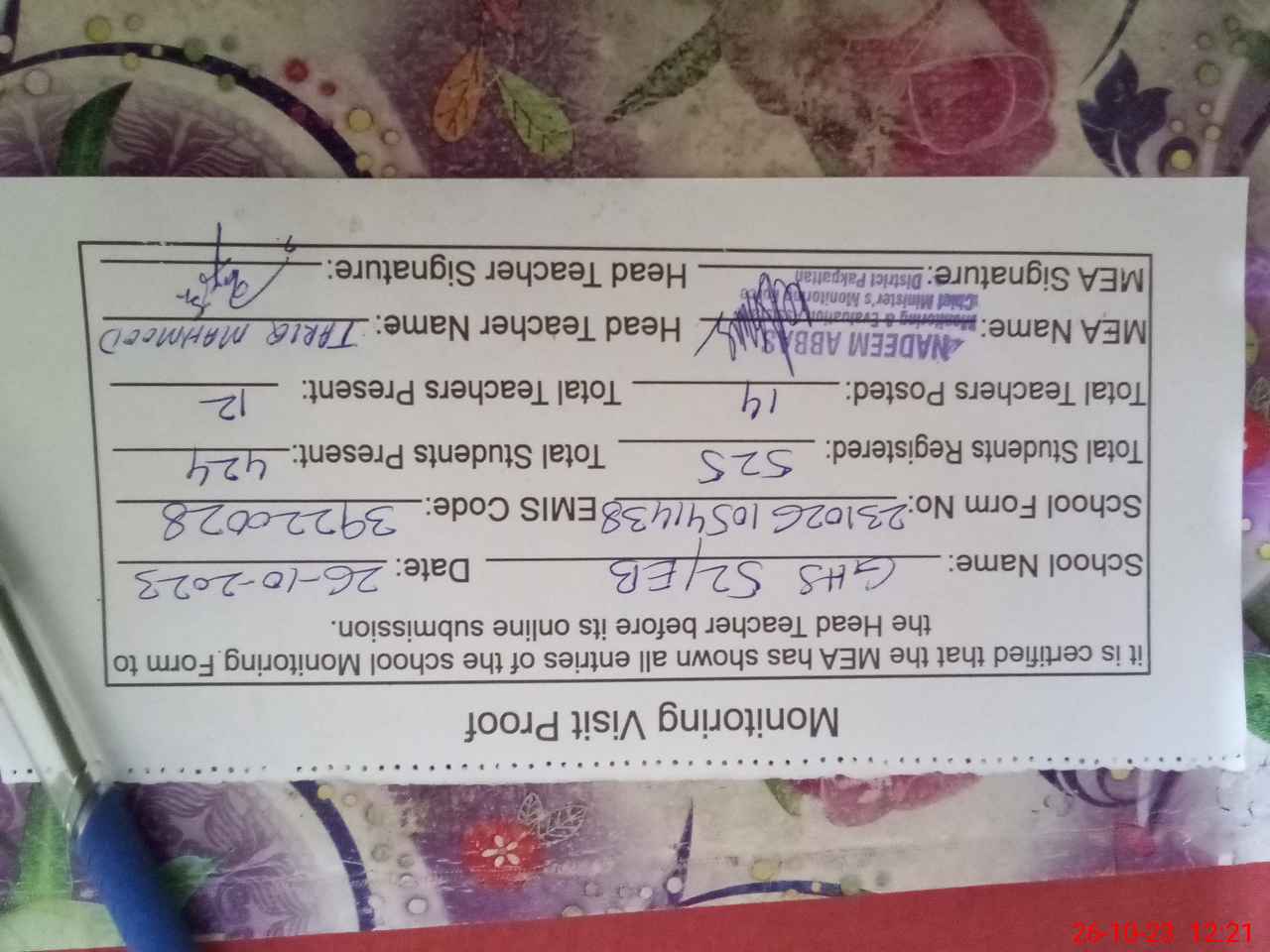 | Certified that this School was Inspected by the Undersigned MEA/DMO Today and the Information Stated Above is as Per Record. | |||||