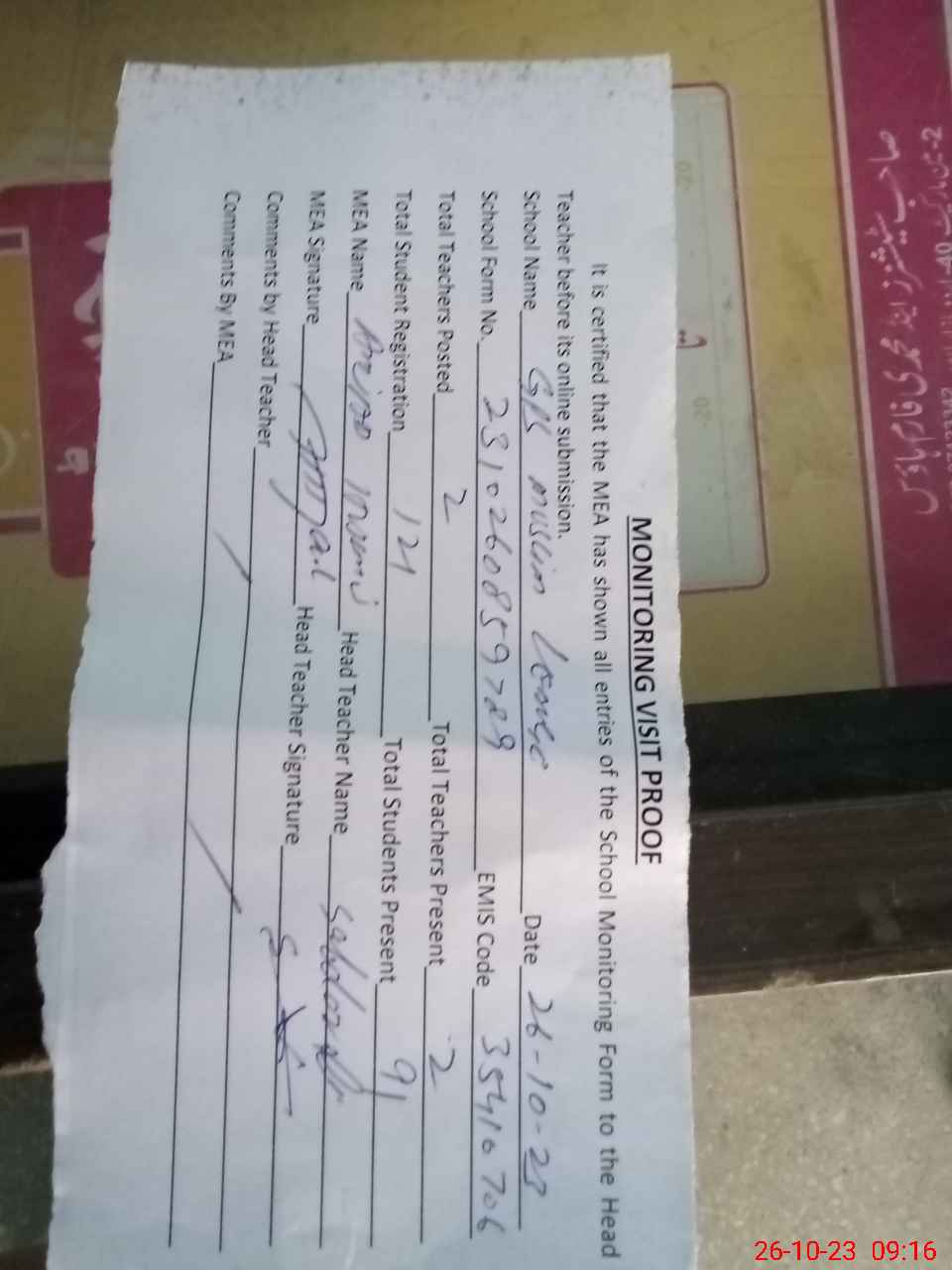 | Attendance Register | Head Teacher | MEA with School | Visit Proof |