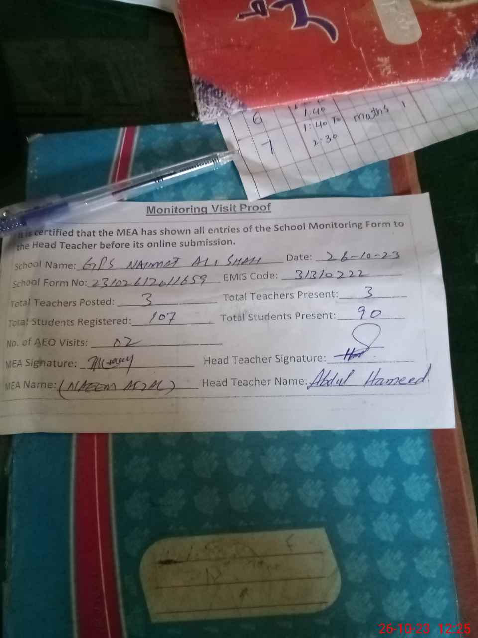 | EMIS Code: 31310222 | Name of School: GPS NEAMAT ALI SHAH | |||