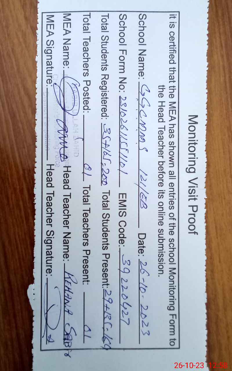 | Attendance Register | Head Teacher | MEA with School | Visit Proof |