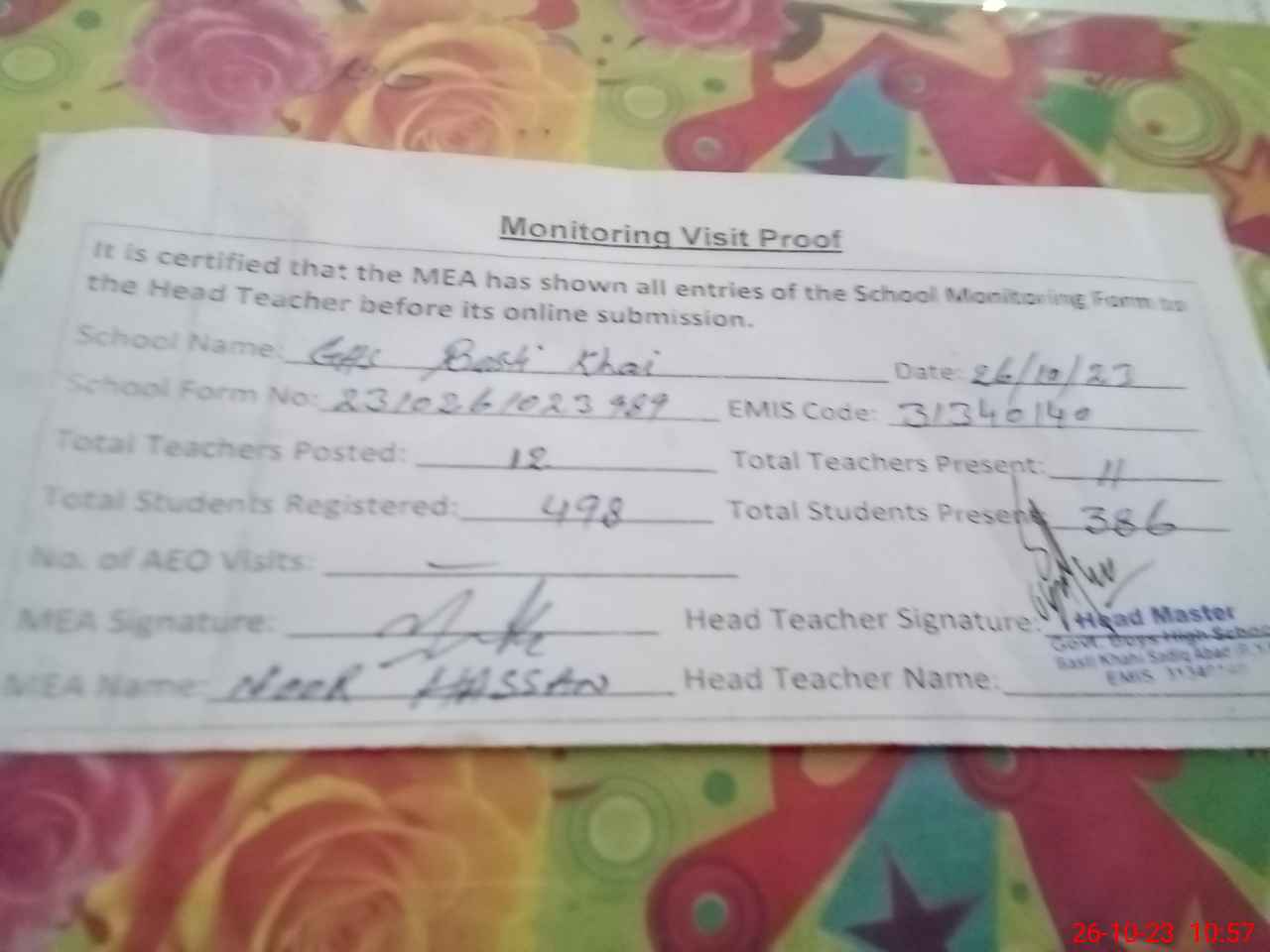 | Certified that this School was Inspected by the Undersigned MEA/DMO Today and the Information Stated Above is as Per Record. | |||||