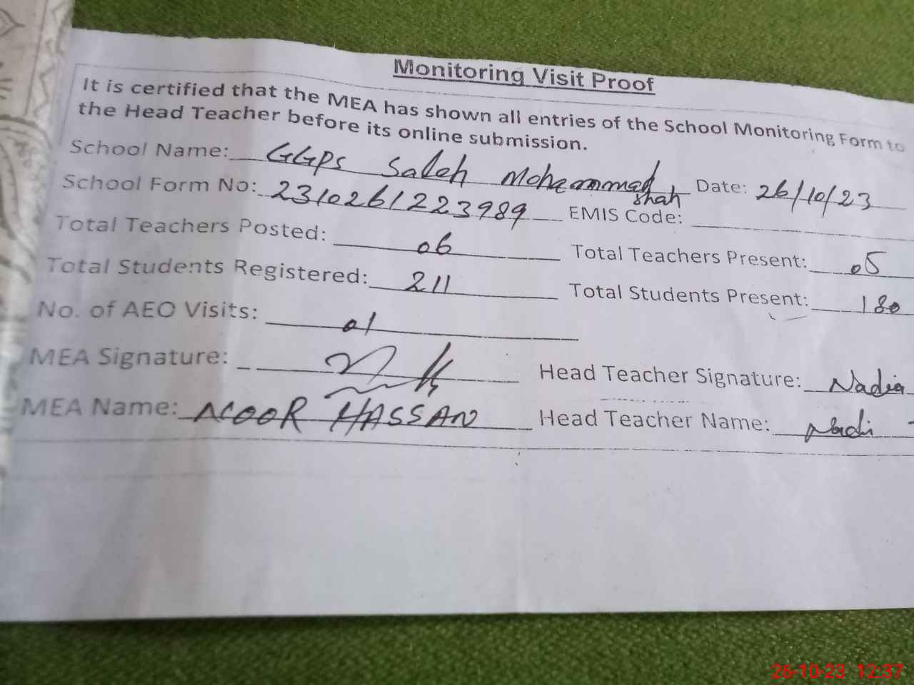 | Attendance Register | Head Teacher | MEA with School | Visit Proof |