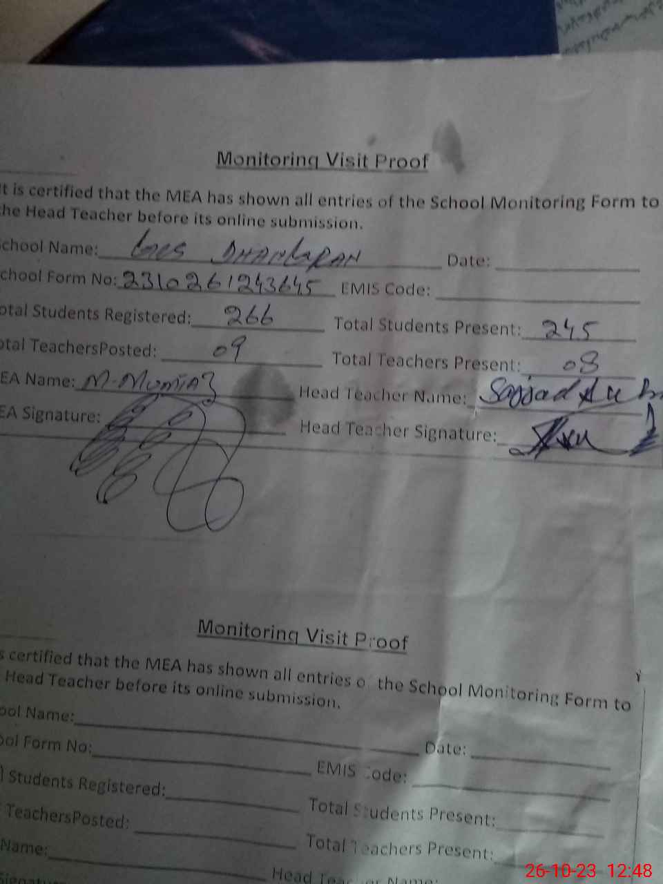 | Certified that this School was Inspected by the Undersigned MEA/DMO Today and the Information Stated Above is as Per Record. | |||||