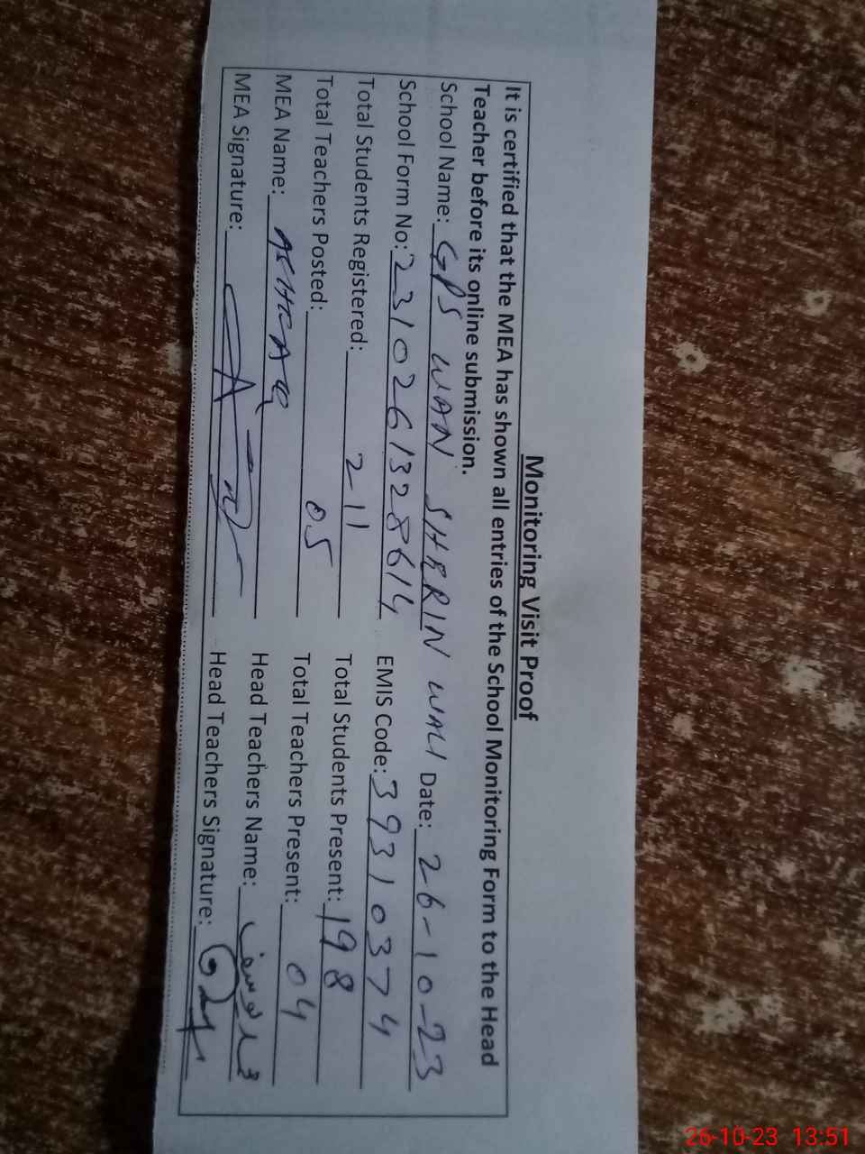| Attendance Register | Head Teacher | MEA with School | Visit Proof |