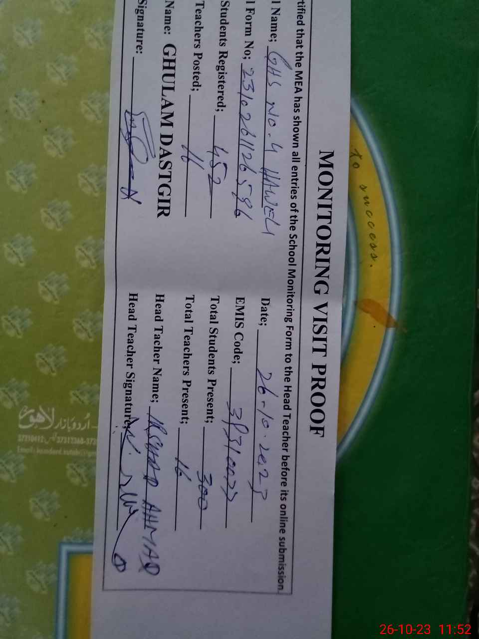 | EMIS Code: 39310077 | Name of School: GHS NO.4 HAVELI LAKHA | |||
