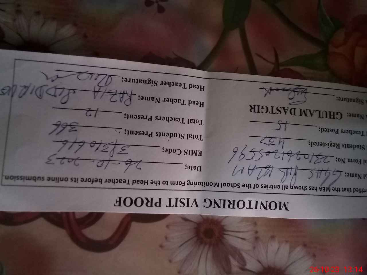 | Attendance Register | Head Teacher | MEA with School | Visit Proof |