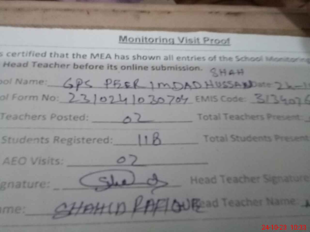 | Attendance Register | Head Teacher | MEA with School | Visit Proof |
