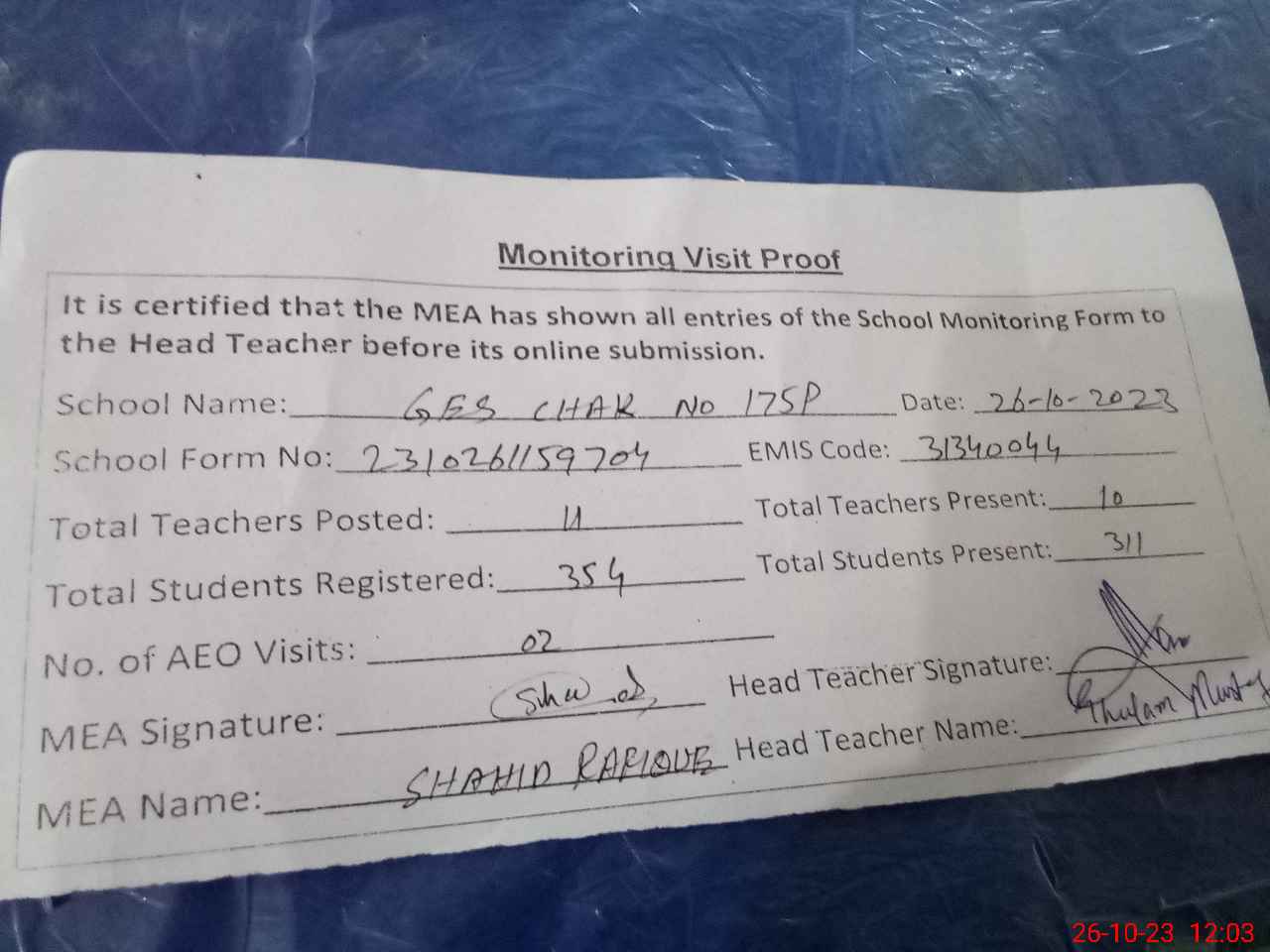 | EMIS Code: 31340044 | Name of School: GES CHAK NO 175/P | |||