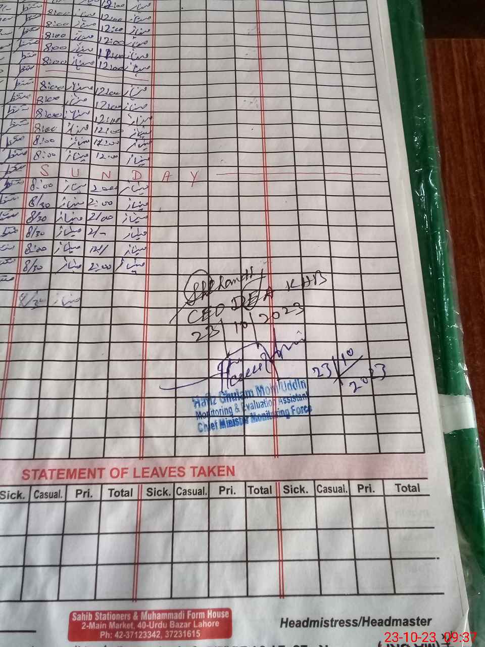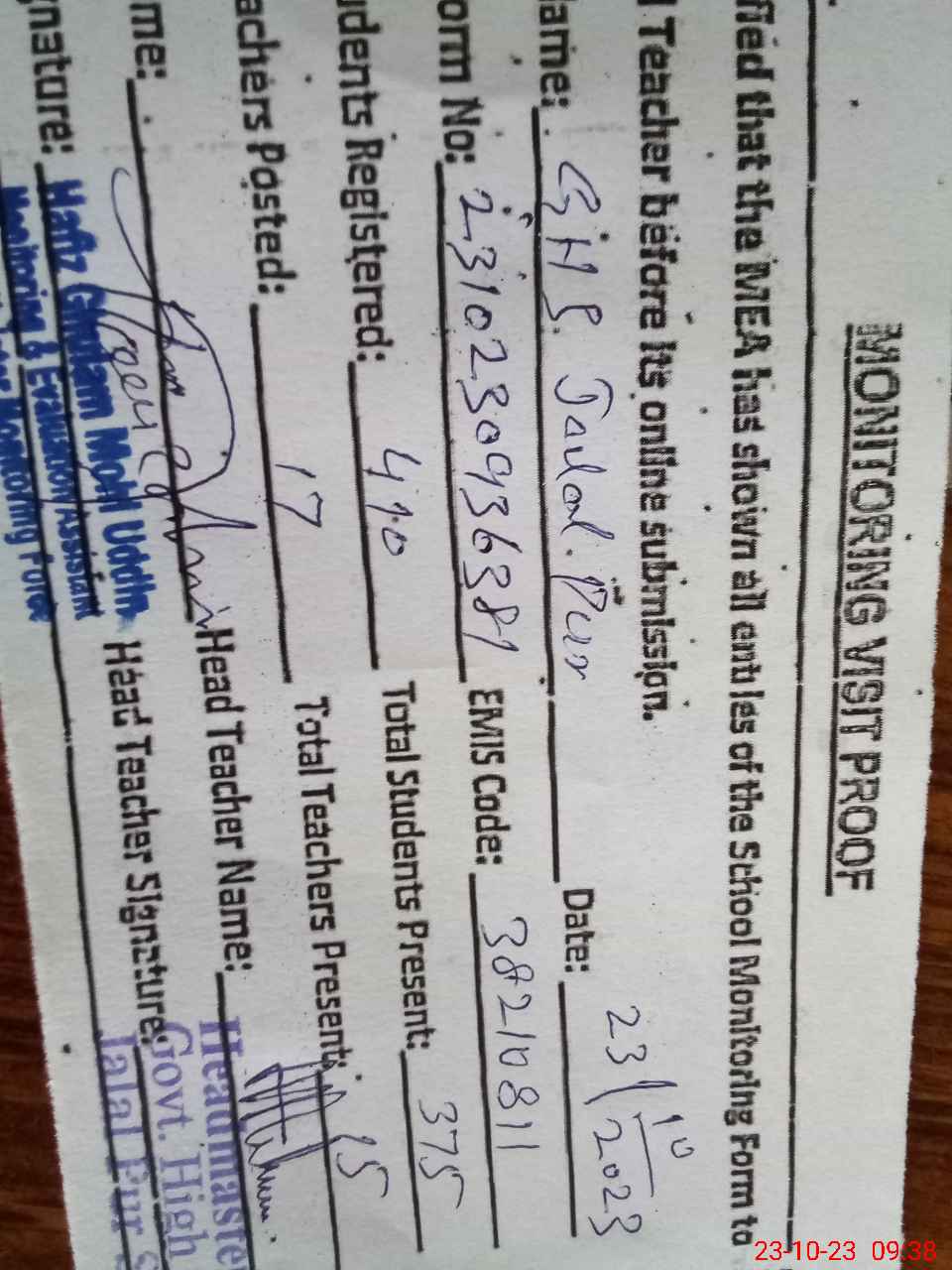 | Attendance Register | Head Teacher | MEA with School | Visit Proof |