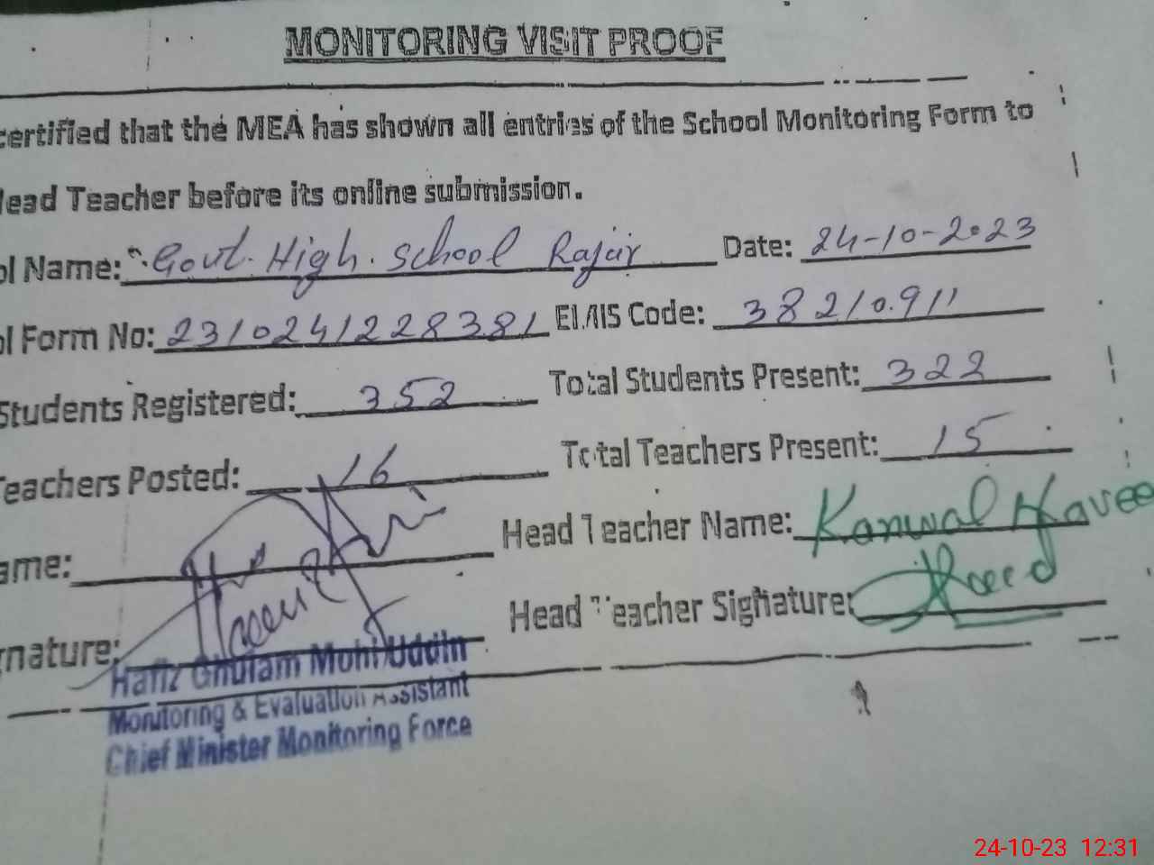 | Attendance Register | Head Teacher | MEA with School | Visit Proof |