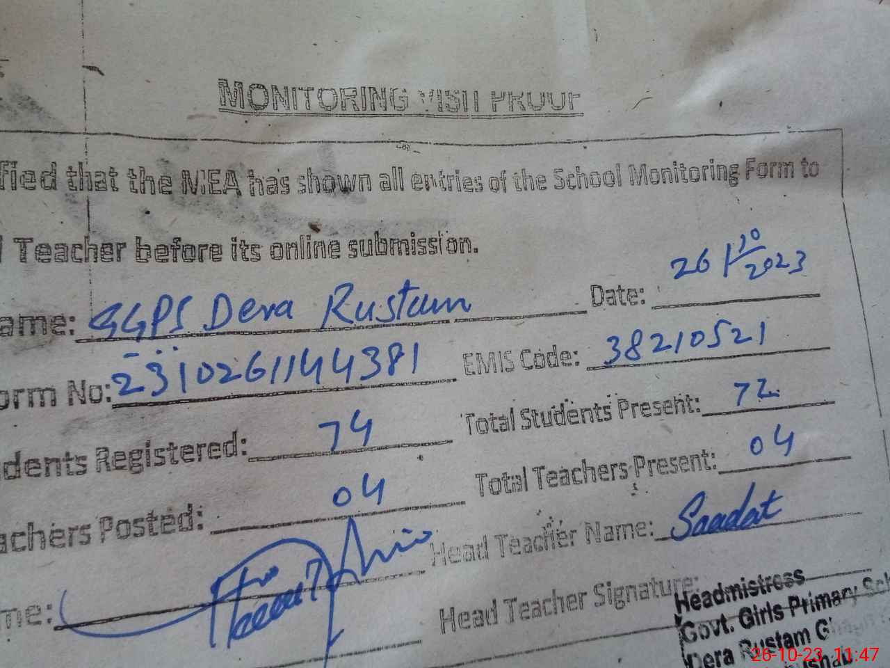 | Attendance Register | Head Teacher | MEA with School | Visit Proof |