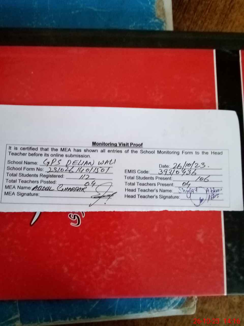 | Attendance Register | Head Teacher | MEA with School | Visit Proof |