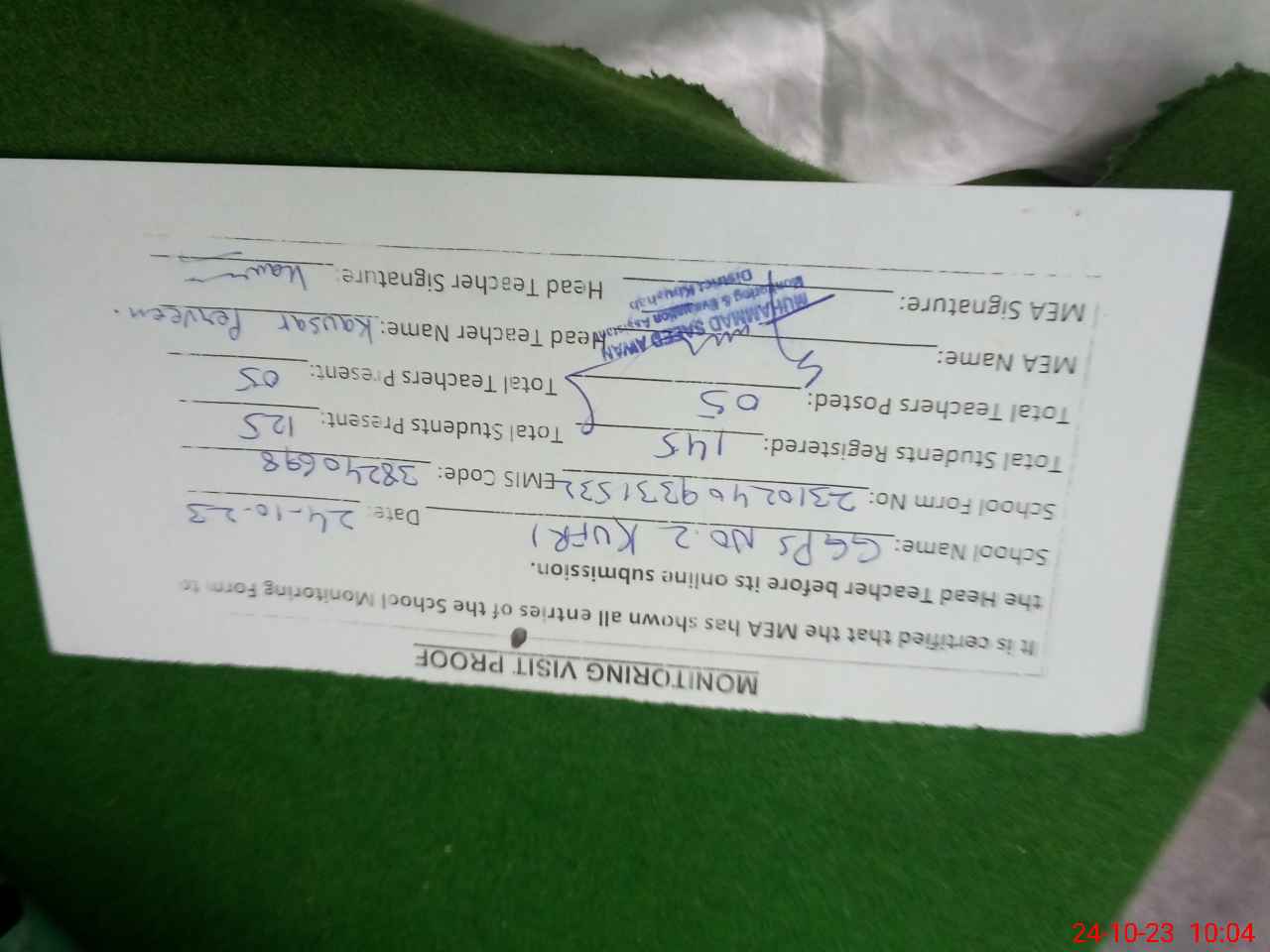 | Certified that this School was Inspected by the Undersigned MEA/DMO Today and the Information Stated Above is as Per Record. | |||||