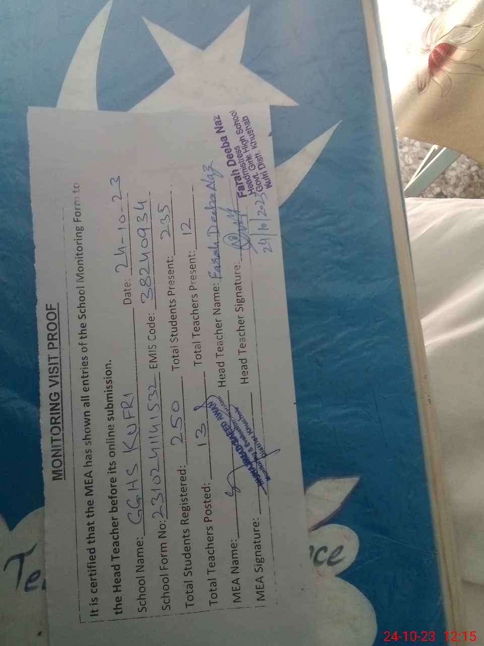 | Certified that this School was Inspected by the Undersigned MEA/DMO Today and the Information Stated Above is as Per Record. | |||||