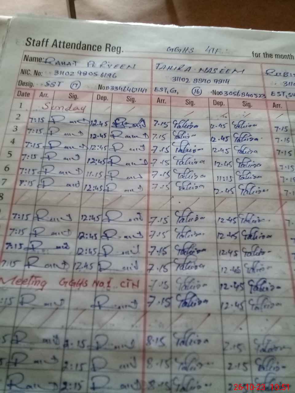 | CNIC | Full Name | Designation | R/C | Absence During Last Calender Month |