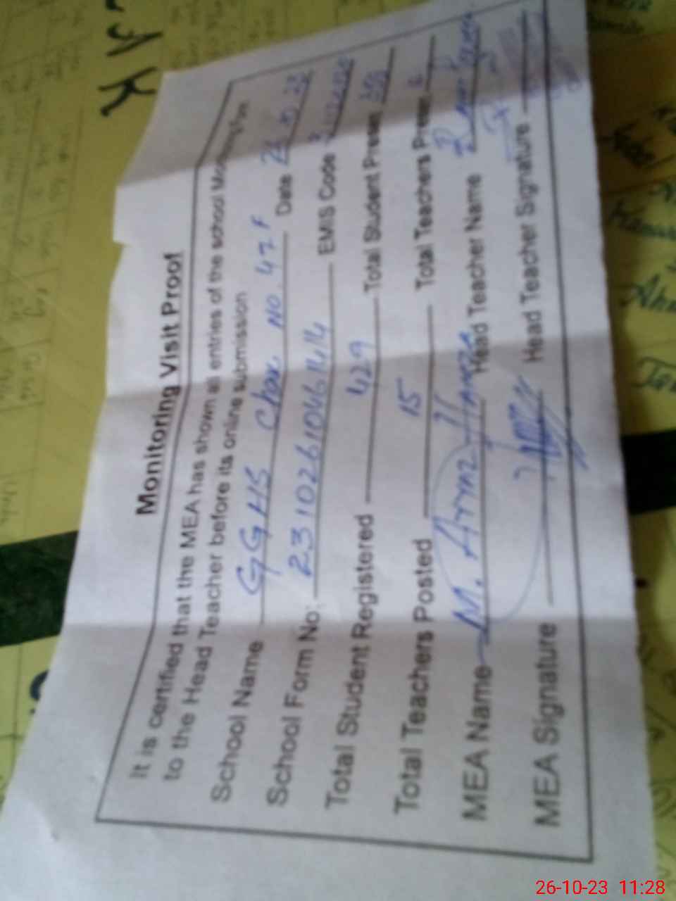 | Attendance Register | Head Teacher | MEA with School | Visit Proof |