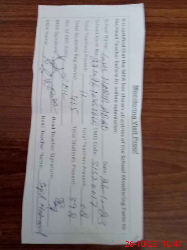 | Attendance Register | Head Teacher | MEA with School | Visit Proof |