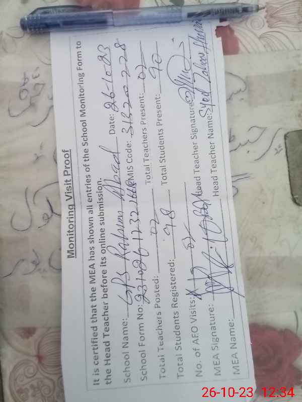 | Attendance Register | Head Teacher | MEA with School | Visit Proof |