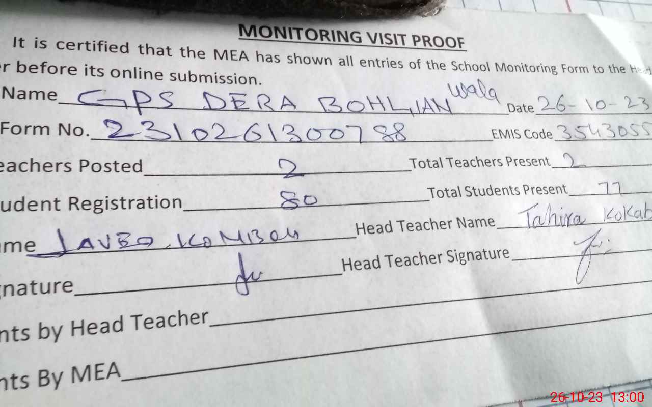 | Attendance Register | Head Teacher | MEA with School | Visit Proof |