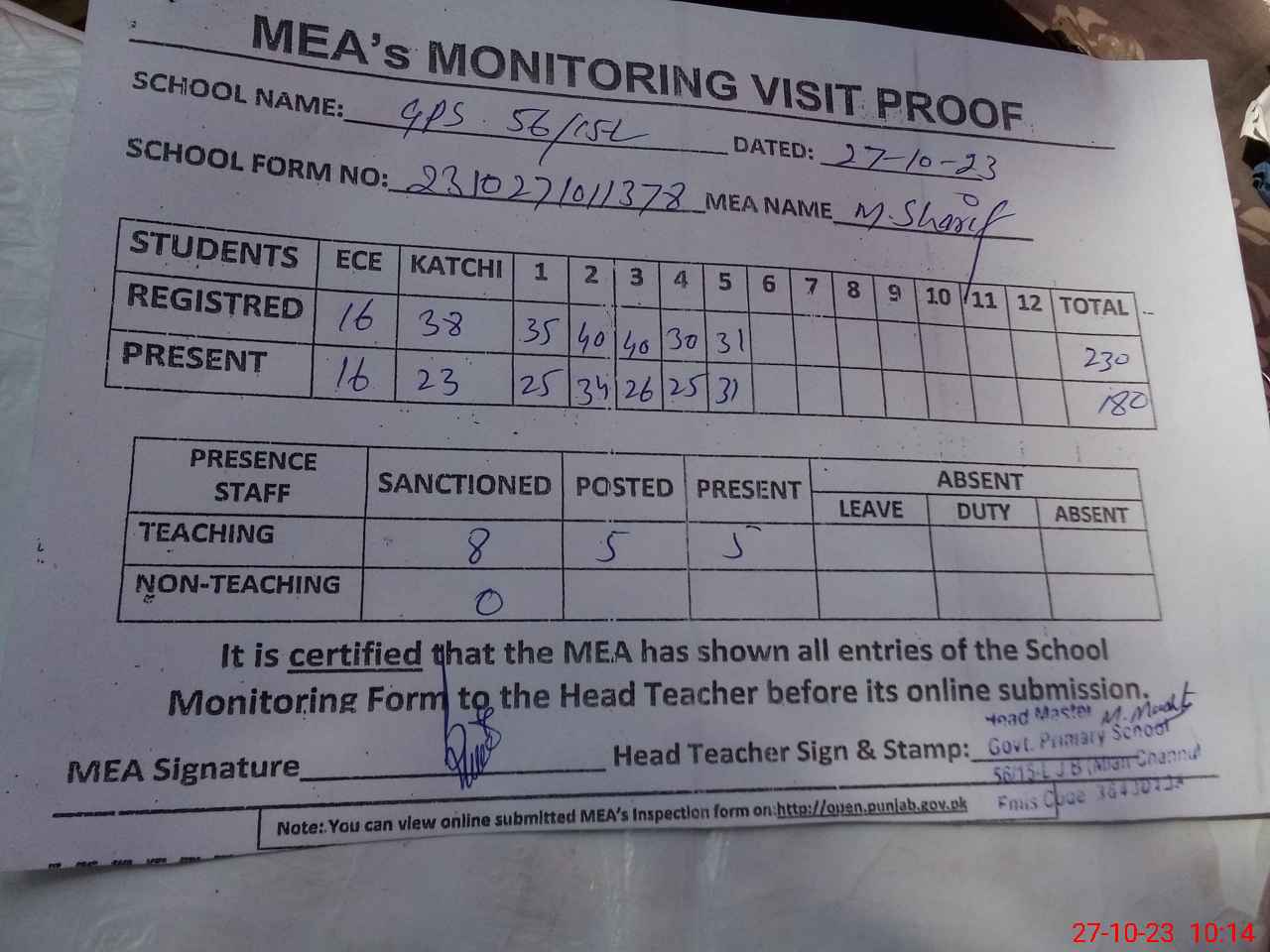 | Certified that this School was Inspected by the Undersigned MEA/DMO Today and the Information Stated Above is as Per Record. | |||||