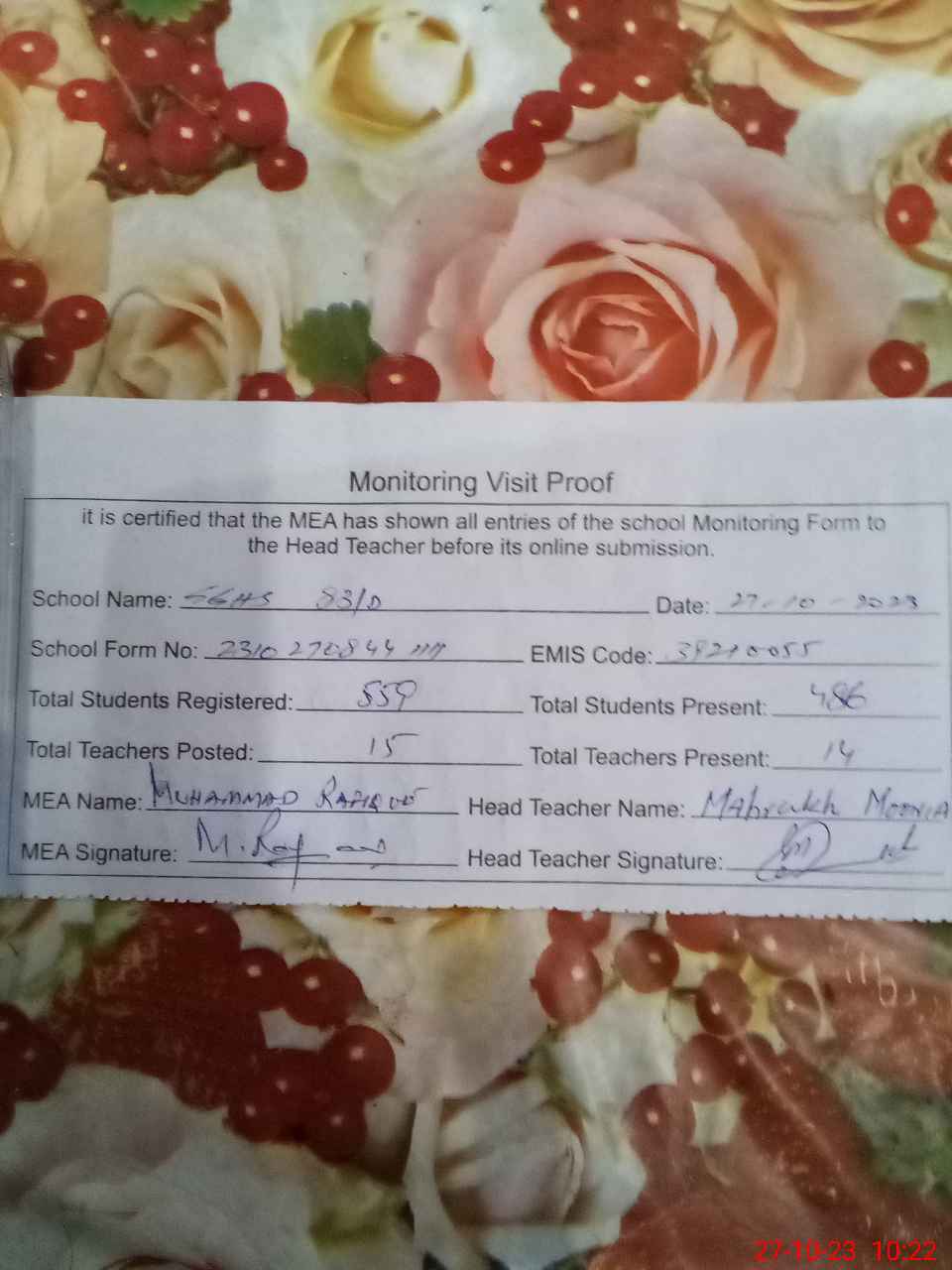 | Certified that this School was Inspected by the Undersigned MEA/DMO Today and the Information Stated Above is as Per Record. | |||||