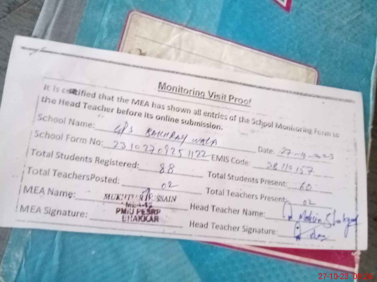 | Attendance Register | Head Teacher | MEA with School | Visit Proof |