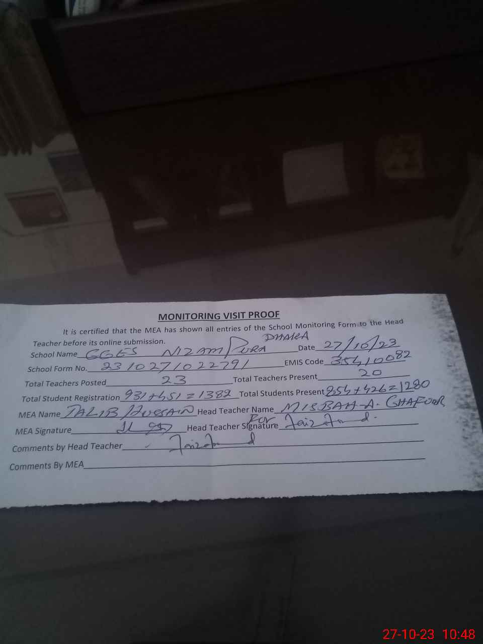 | Attendance Register | Head Teacher | MEA with School | Visit Proof |