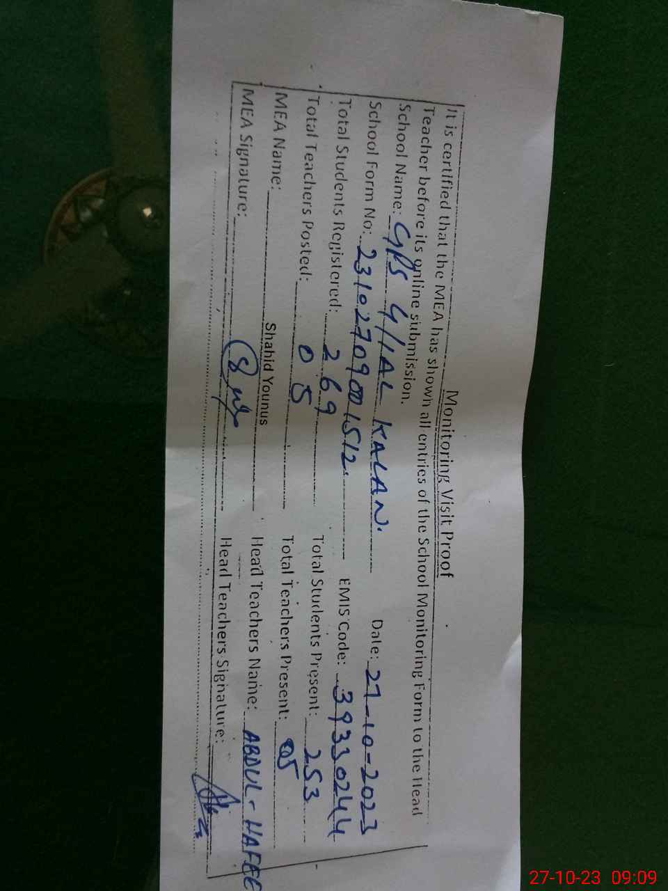 | Attendance Register | Head Teacher | MEA with School | Visit Proof |