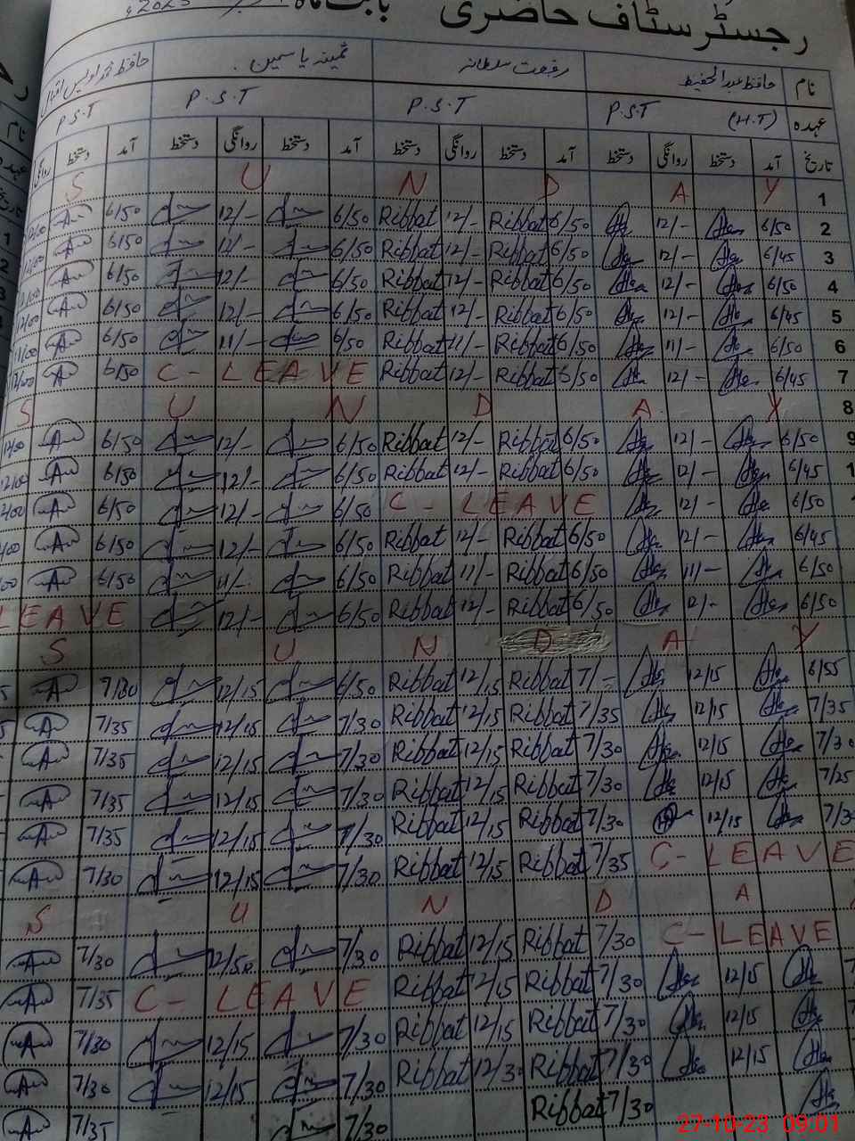 | CNIC | Full Name | Designation | R/C | Absence During Last Calender Month |