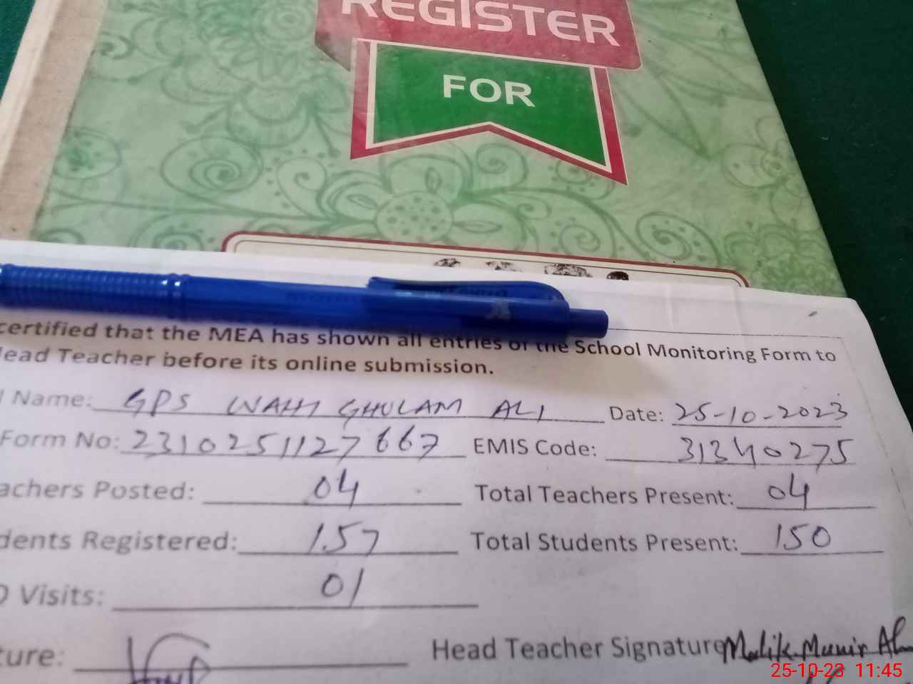 | Attendance Register | Head Teacher | MEA with School | Visit Proof |